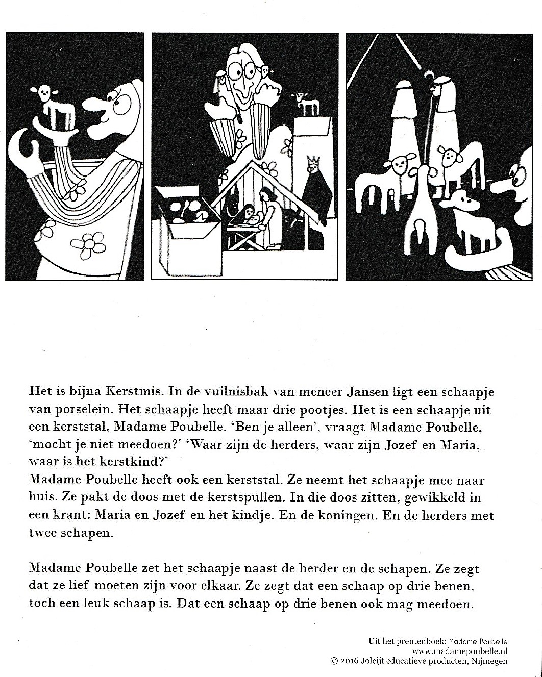 In de eerste projectweek lazen de leerkrachten verhaaltjes voor uit het prentenboek Madame Poubelle en bespraken ze de thema’s die in de verhaaltjes voor komen, al dan niet met behulp van de aanknopingspunten uit het lesboek. De leerlingen leerden ook het liedje ”Ken jij Madame Poubelle?” In de tweede projectweek kwam Madame Poubelle, gespeeld door Mireille Hermens, langs met een grote kliko. Zij werd direct bij binnenkomst, in het schoolgebouw, herkend door de leerlingen en met enthousiasme begroet. In de klas stelde Madame Poubelle zich voor en haalde ze uit de kliko allerlei voorwerpen die ze had gevonden, in de verschillende verhaaltjes, uit het prentenboek. Ze vertelde waarvoor ze de voorwerpen had (her)gebruikt. De leerlingen beaamden dat gretig en genoten. In sommige klassen werd ook gesproken over wat genoemd werd: “moeilijke duurzame begrippen”, als recycling. Na het gezamenlijk zingen van het liedje werd met Madame Poubelle geknutseld met afval. In het kader van het andere thema “muziek” maakten leerlingen van twee klassen muziekinstrumenten van afval: rammelaar (blikje met ongekookte macaroni), toeter of trommel. Of ze versierden een fotolijst. Madame Poubelle hielp mee, waar dat kon, samen met de leerkrachten. Het was een leuke happening.
